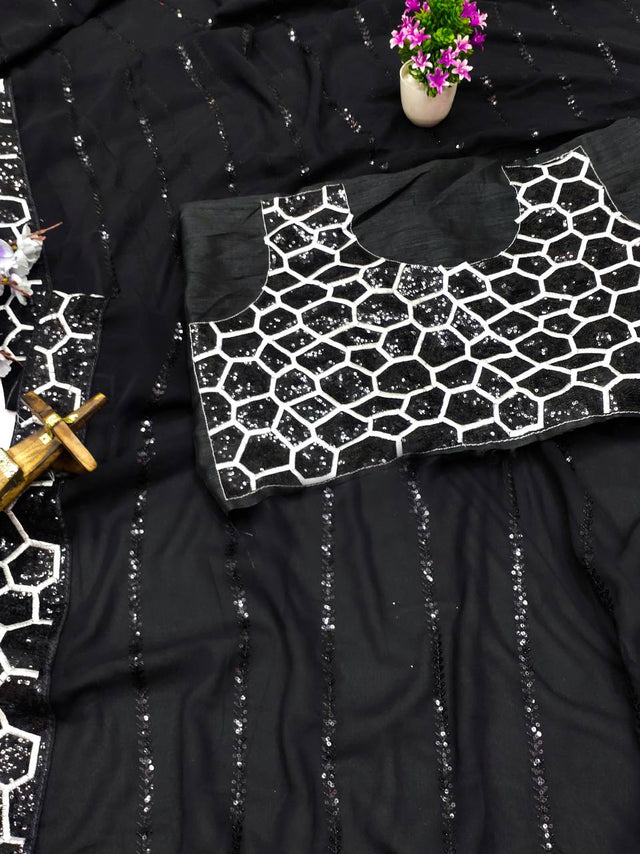🥻 Sari Fabric: Heavy Georgette with Embroidery Sequins work & Fancy Lace Border