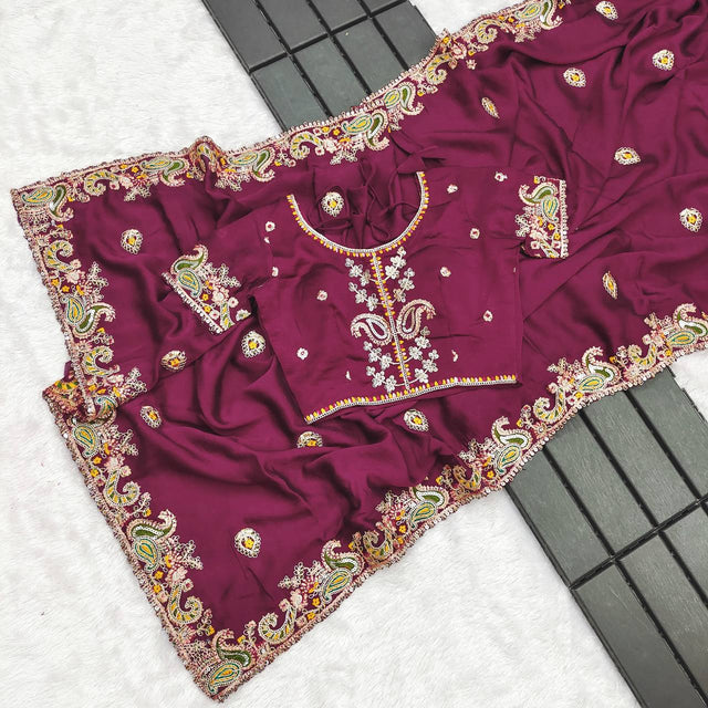 Alluring Wine Color Crush Work Saree For Festival Wear