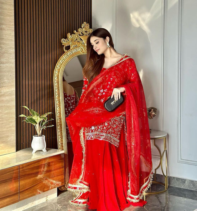 Amazing Red Embroidery Sequence Work Sharara Suit