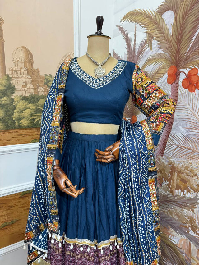 Awesome Teal Blue Rayon With Foil Print Lehenga Choli