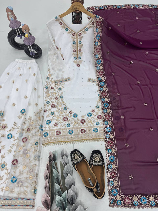 Awesome White Color Work Sharara Suit With Wine Dupatta