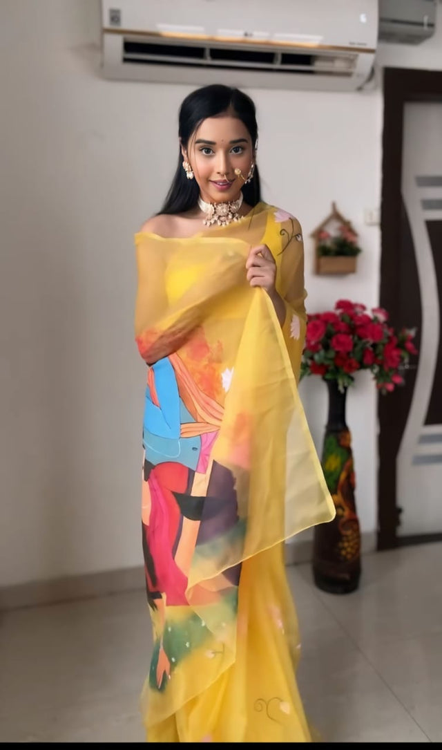 Awesome Yellow Color Radha Krishna Design Ready To Wear Saree