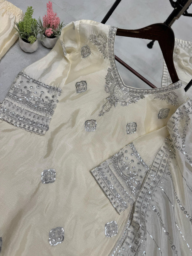 Beautiful Chinon Embroidery Work Cream Color Sharara Suit