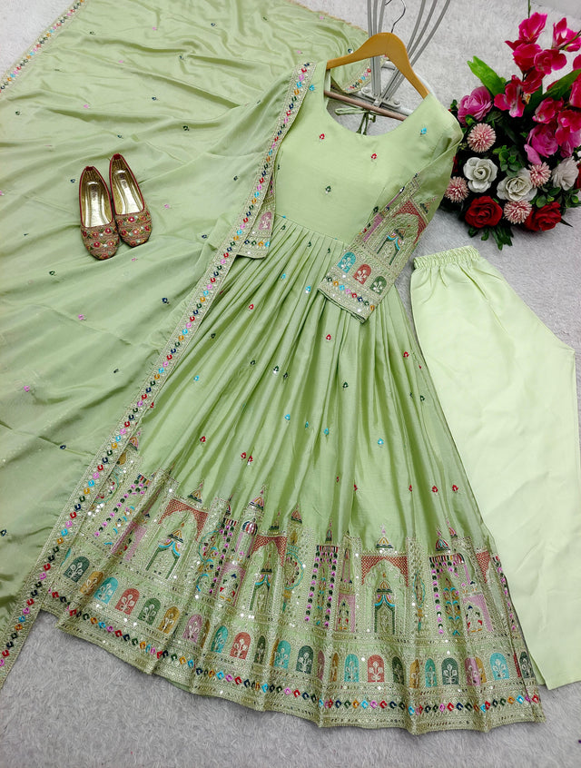 Beautiful Embroidery Work Pista Color Anarkali Gown