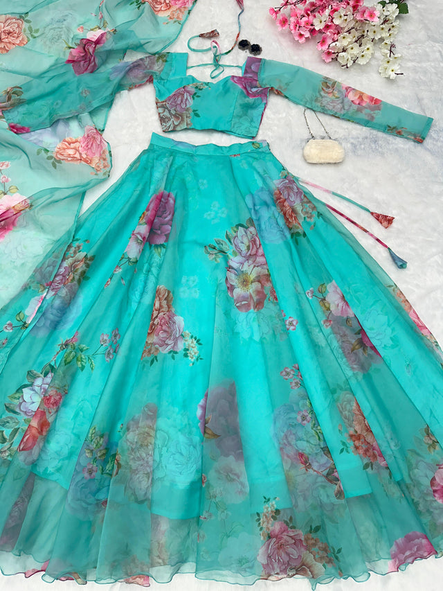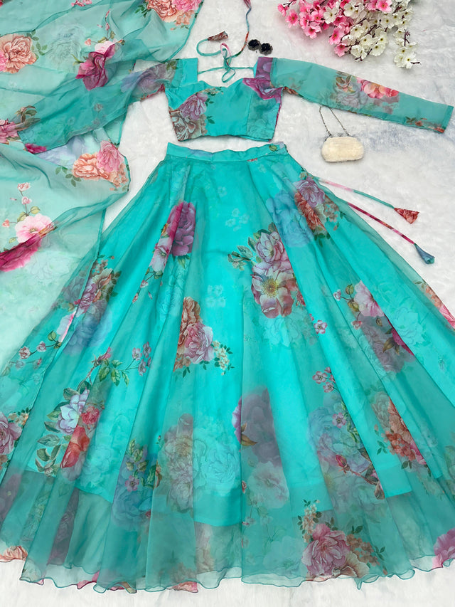 Beautiful Flower Print Sky Blue Organza Silk Lehenga Choli
