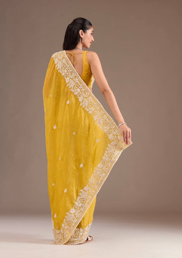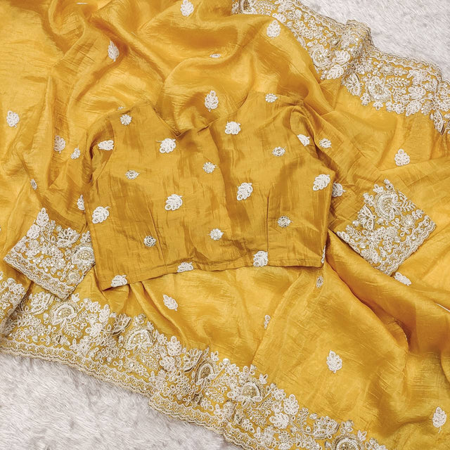🥻 Sari Fabric: Premium Gold Crush With Heavy Embroidery Codding & Sequins Work With Fancy Cut Work Border