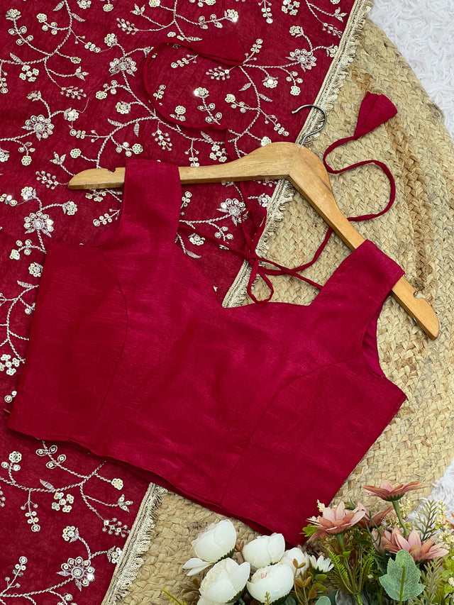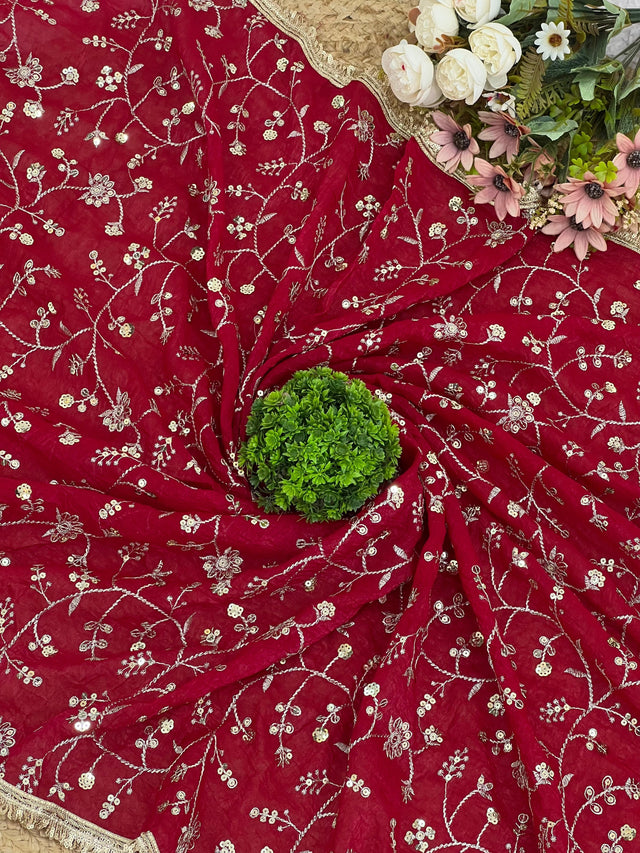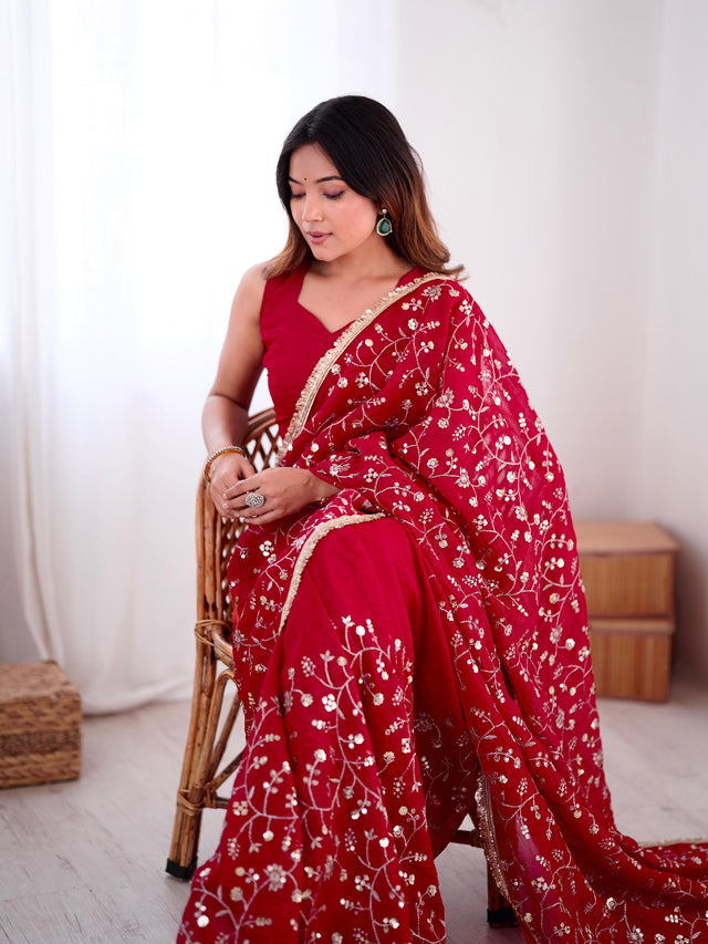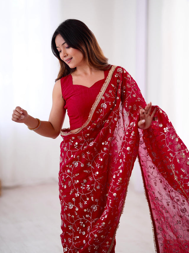 Beautiful Red Crunchy Silk Embroidery Work Saree