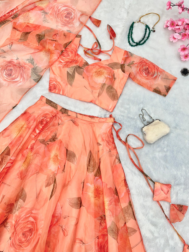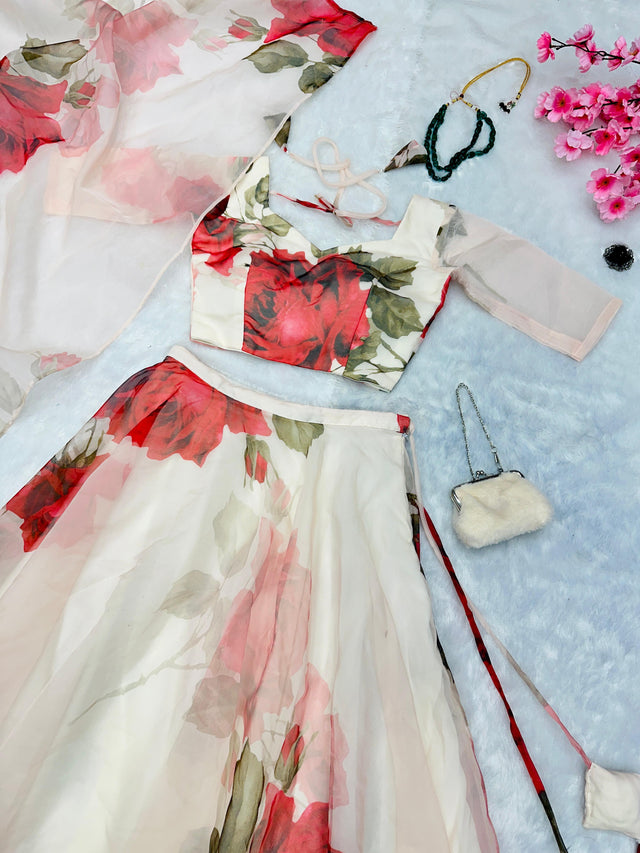 Beautiful White Color Organza Floral Printed Lehenga Choli