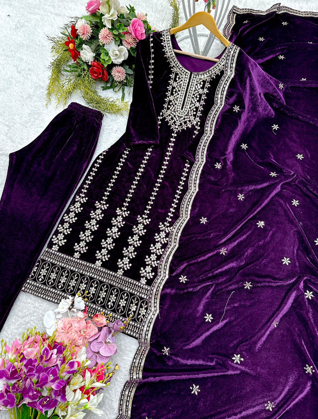 Beautiful Wine Color Velvet 5mm Sequence Work Salwar Suit