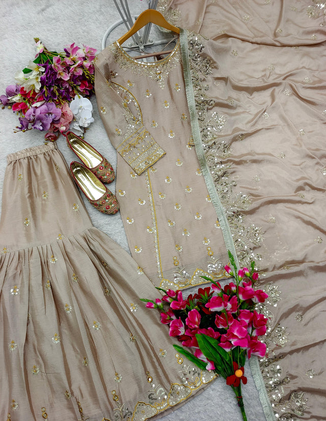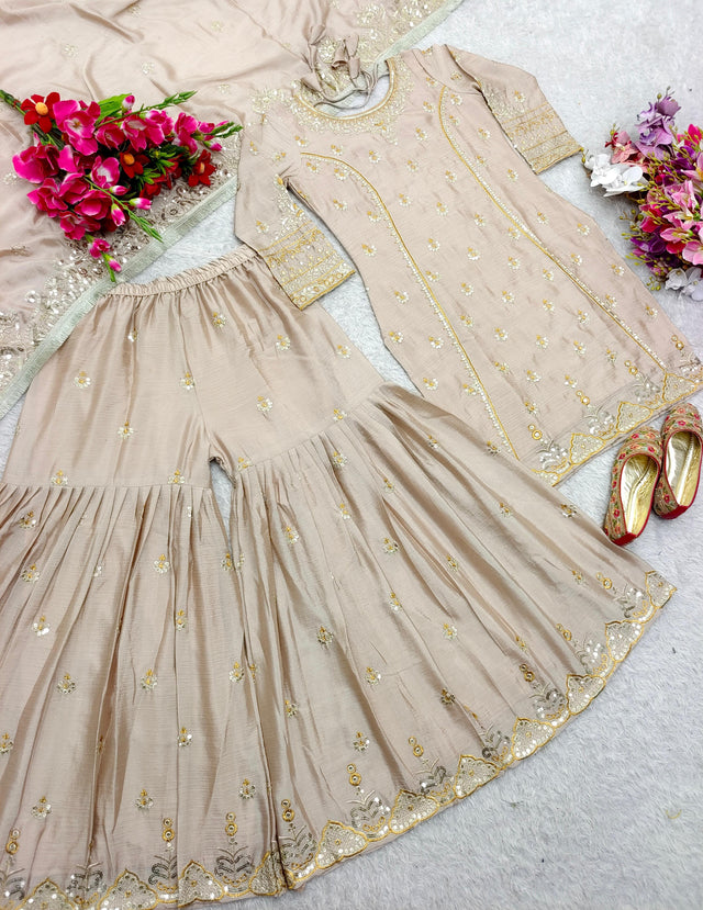 Beige Color Embroidery Work Alluring Sharara Suit