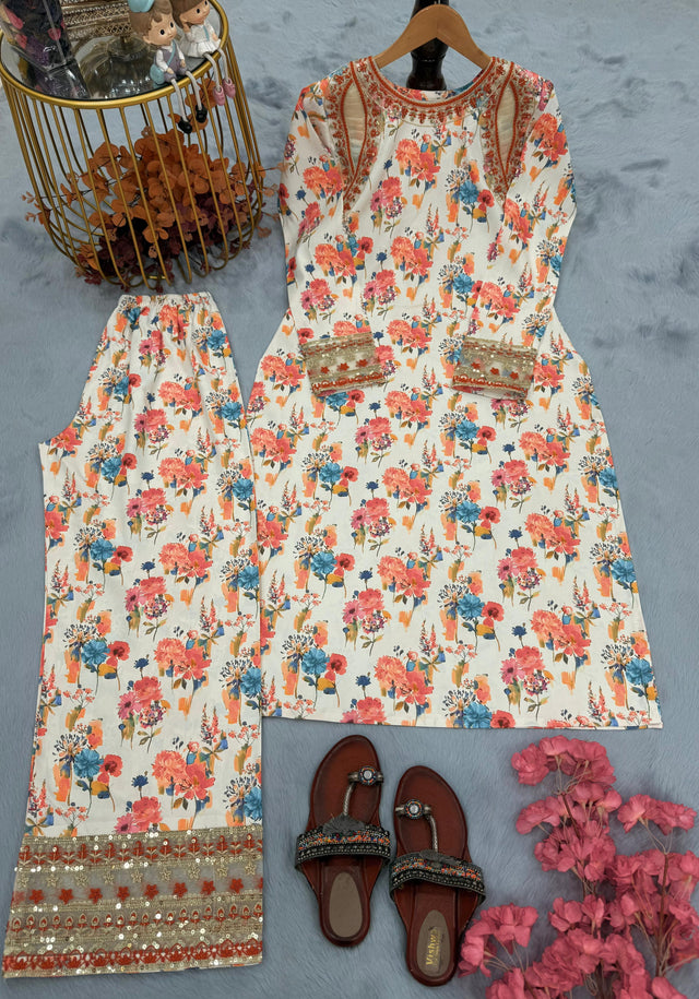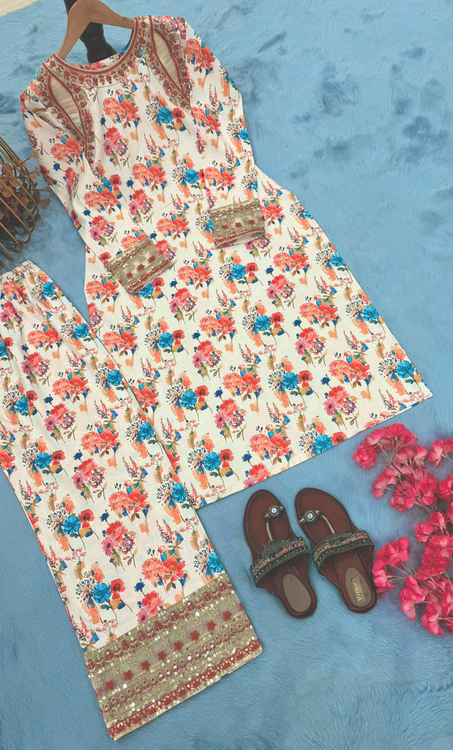 Palazzo Fabric : Pure Natural Roman Silk With Digital Print With Embroidery 5 mm Sequence Work With Elastic