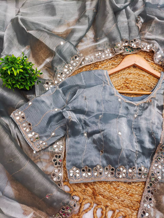 🧷 Blouse : Premium Berberry With Heavy Front & Back Both Side Embroidery Work & Real Mirror 🪞 Work Unstitched Blouse