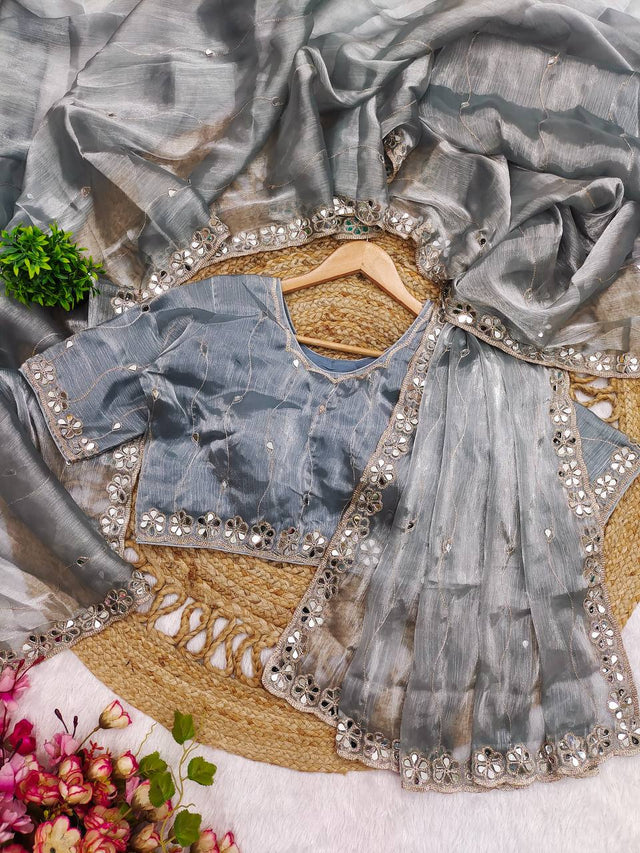 🥻 Sari Fabric : Premium Berberry With Heavy Embroidery Work & Real Mirror 🪞 Work With Fancy CutWork Border