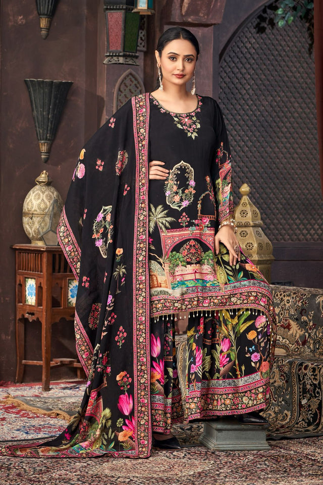 Black Color Georgette Printed & Mirror Work Palazzo Suit