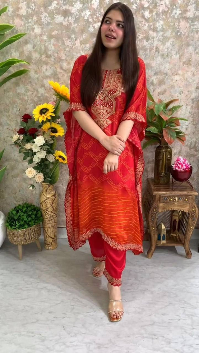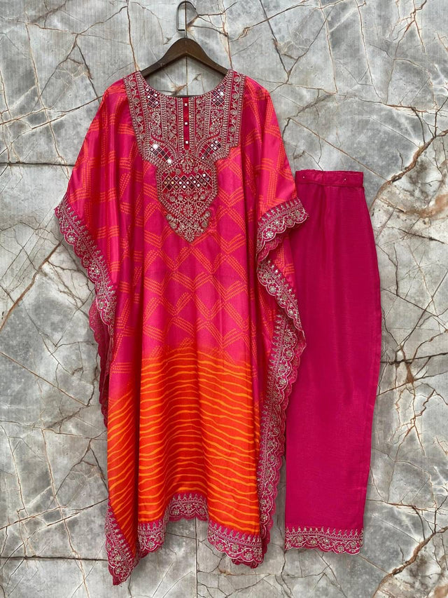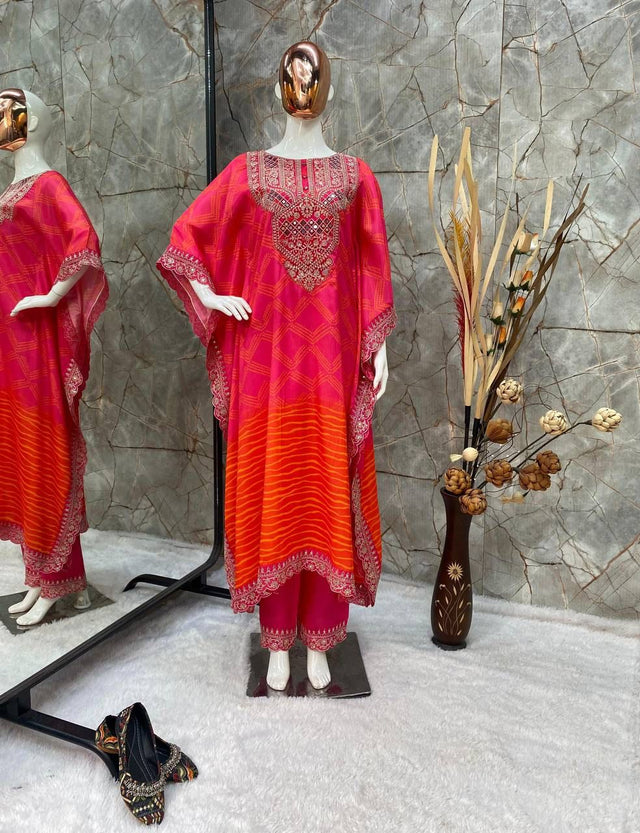 Blissful Chinon Embroidered Work Pink & Orange Color Kaftan Suit