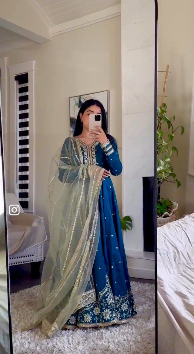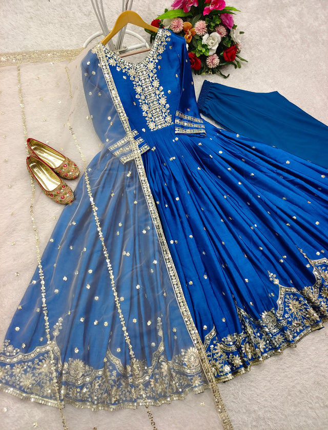 Blue Color Embroidery Work Long Gown With Net Dupatta