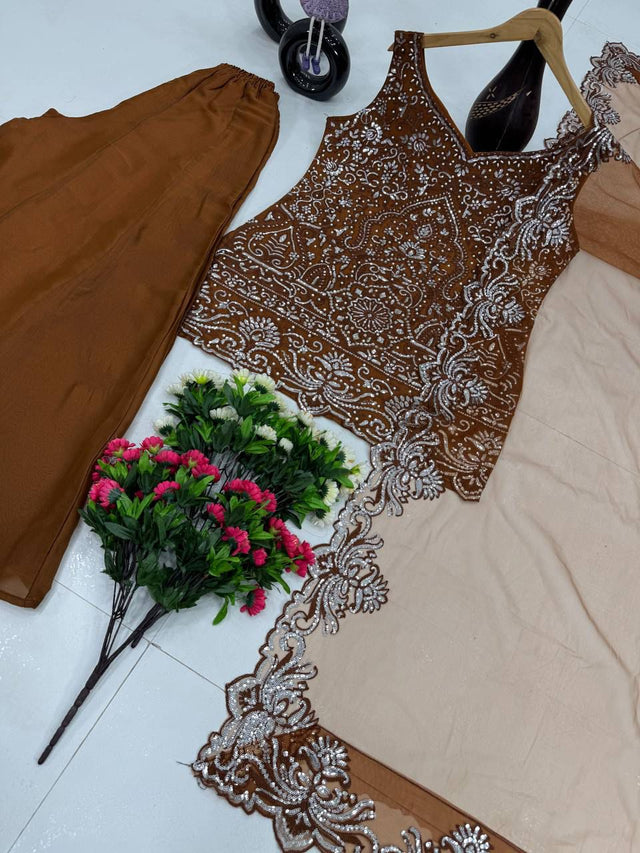 Brown Color Full Stitched Embroidered Precious Sharara Suit