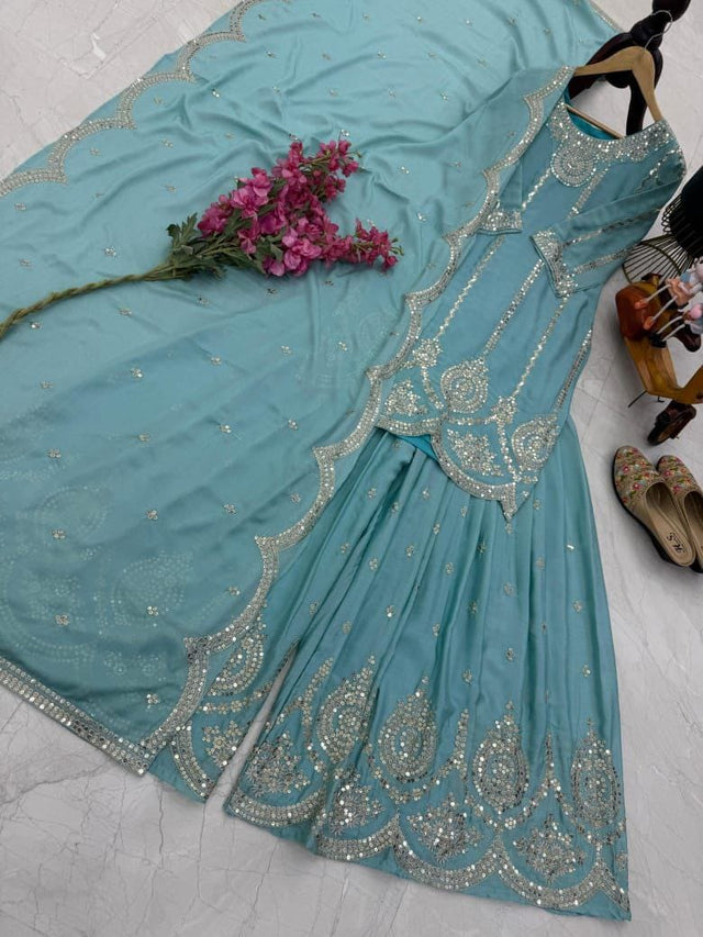 Sky Blue Color Heavy Work Chinon Silk Palazzo Suit