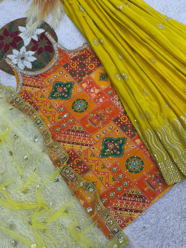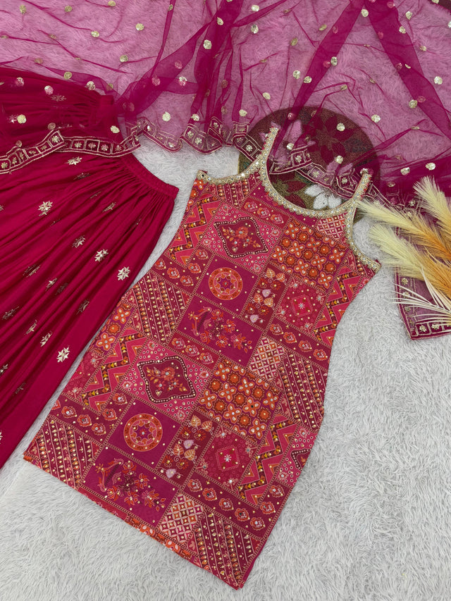💥 Presenting New Digital Printed And Embroidery Sequence Worked Top-Palazzo And Dupatta Set Fully Stitched Ready To Wear 🔥😍🥰