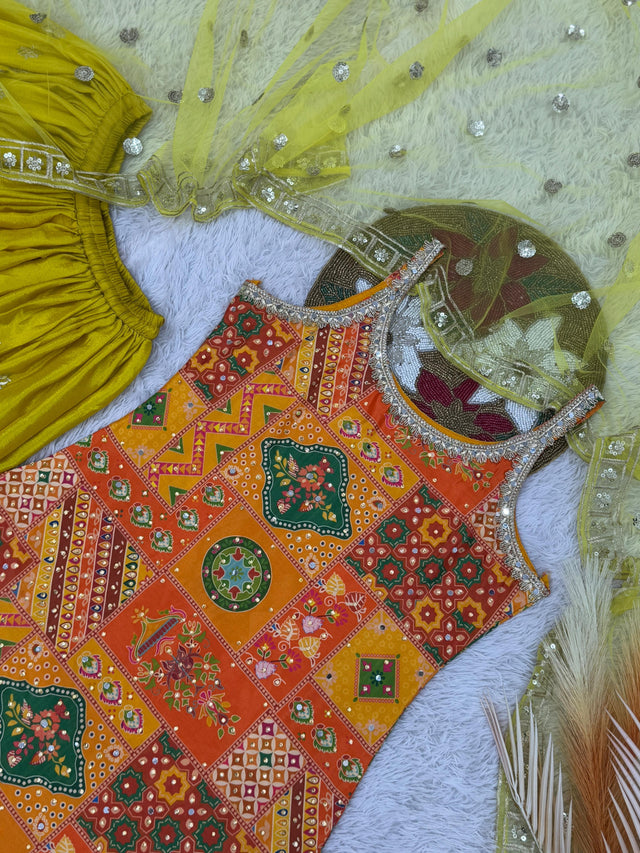 Top Work : Fancy Digital Print With Real Mirror And Stone Hand Work With Neck Fancy Lace Border