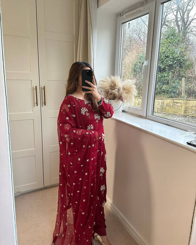 Charming Embroidery 5mm Sequence Work Red Color Sharara Suit