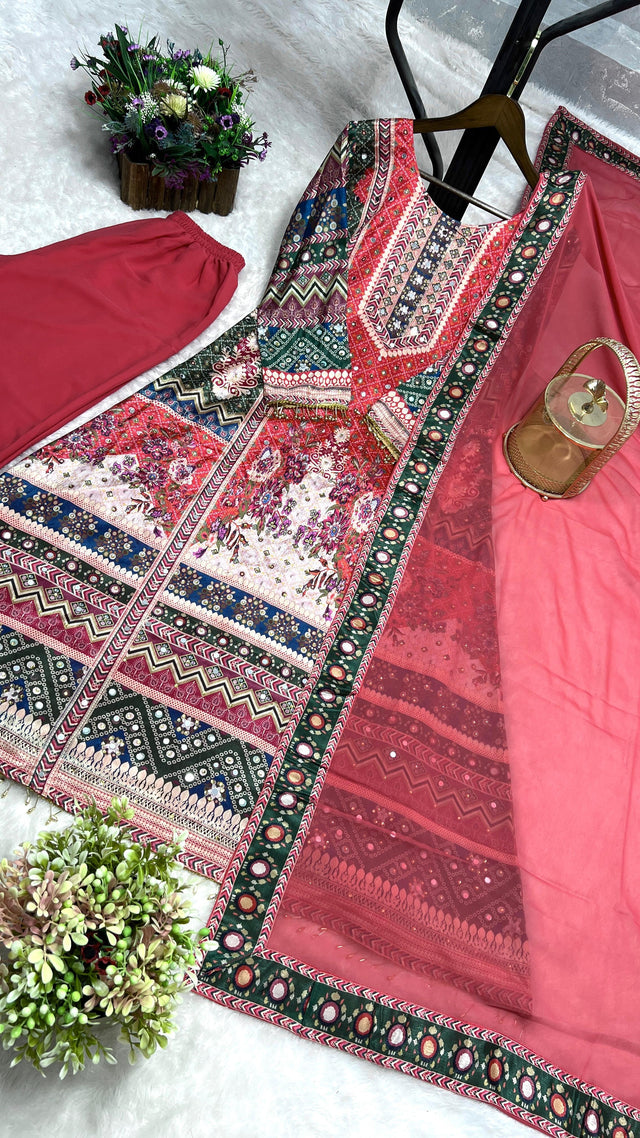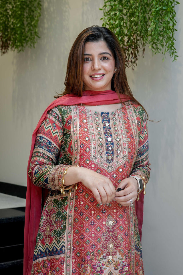 Chinon Silk Printed Mirror Work Palazzo Suit