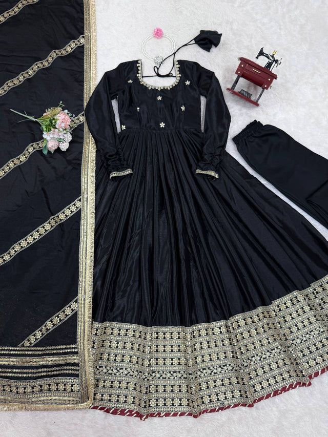 Chinon Silk Sequence Work Black Color Anarkali Gown