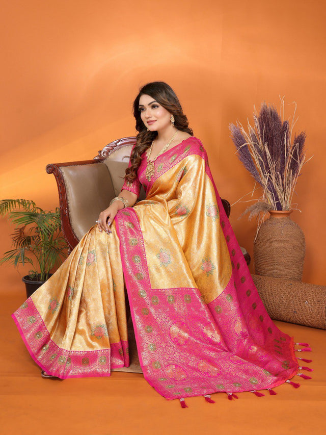 Classic Banarasi Silk Yellow & Pink Color Saree