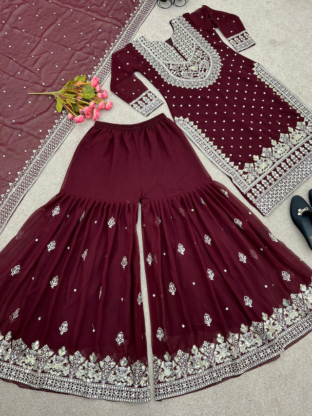 Decent Embroidery Sequence Work Maroon Color Sharara Suit