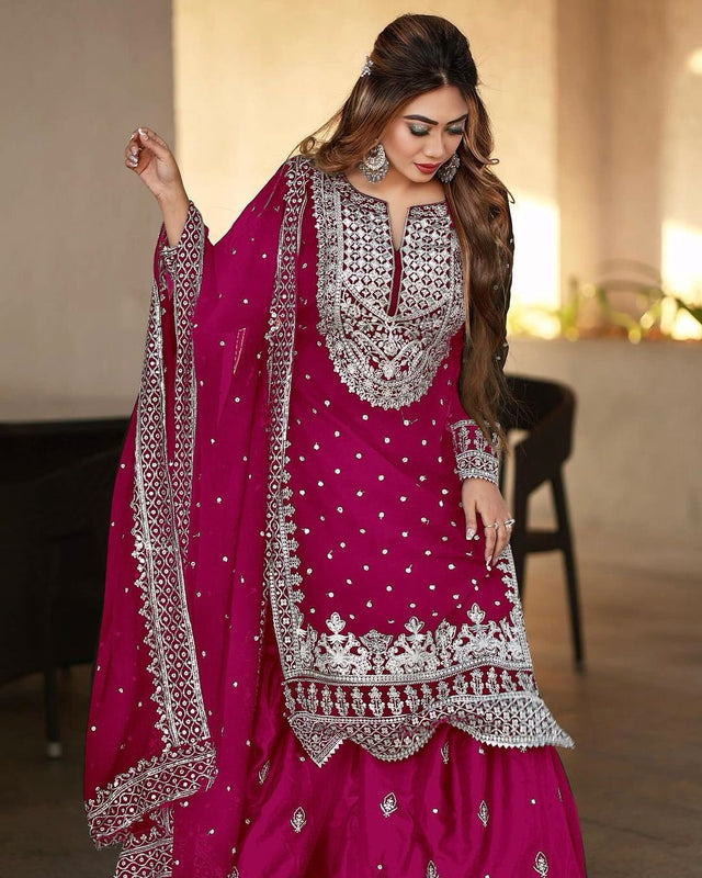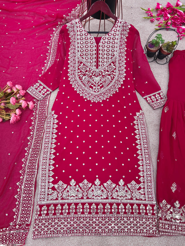Decent Embroidery Sequence Work Pink Color Sharara Suit