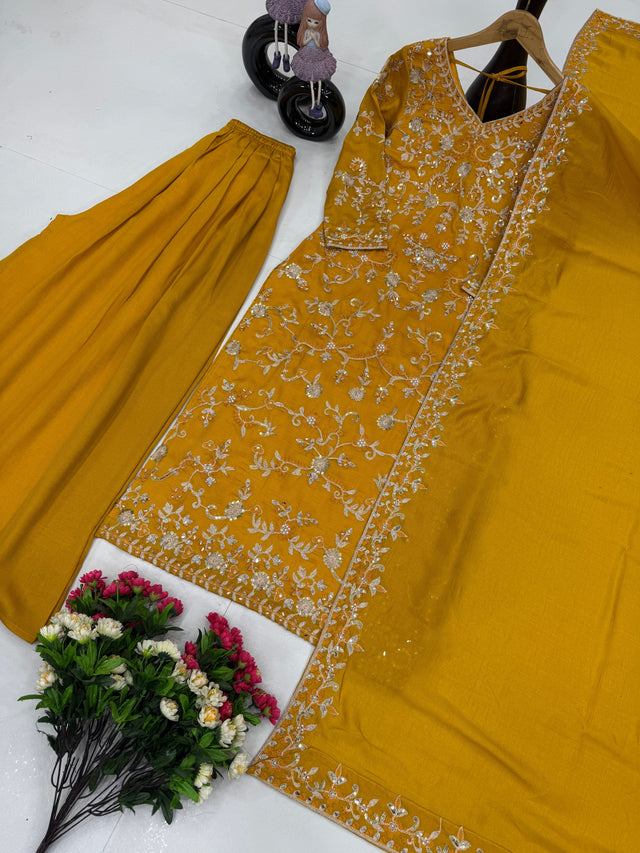 Delightful Embroidery sequence Work Yellow Color Sharara Suit