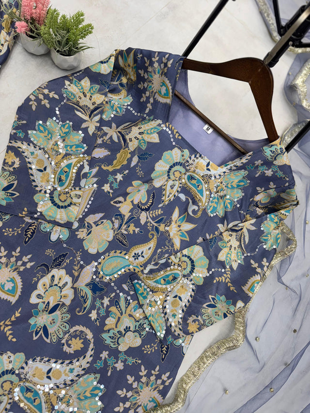 # Sharara:. Chinon Print With Sequence Embroidery Work
