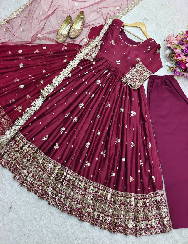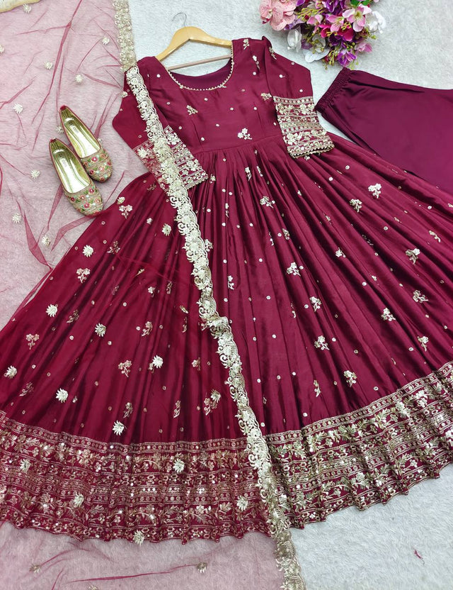 *Gwon Fabric* ย : Pure Cinon Silk With Heavy Embroidery 5mm Sequence Work With Full-Sleeve With (*Attached Ped*)