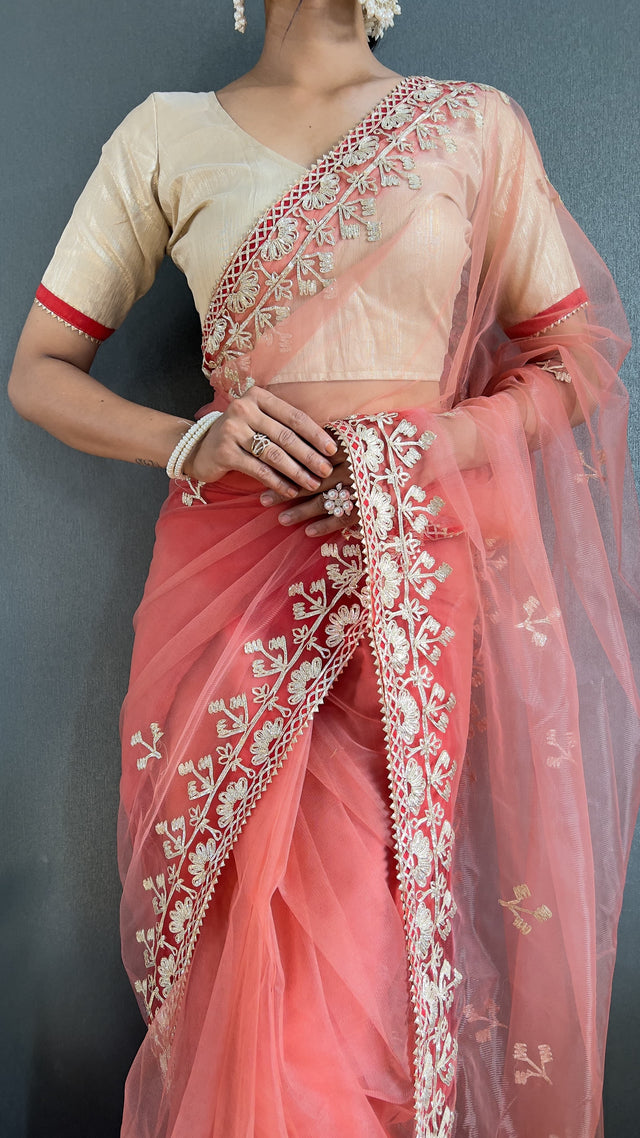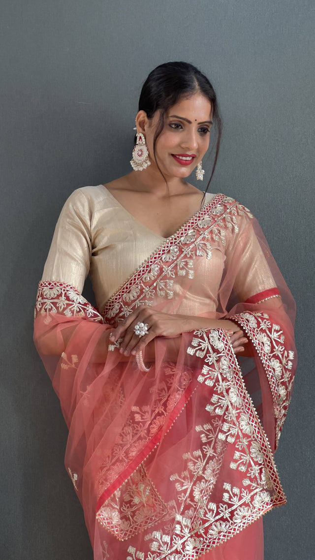Saree : Premium Soft Padding Butterfly Net Embellished With Beautiful Hand Gota Work With Attached Inner( Ready To Wear )