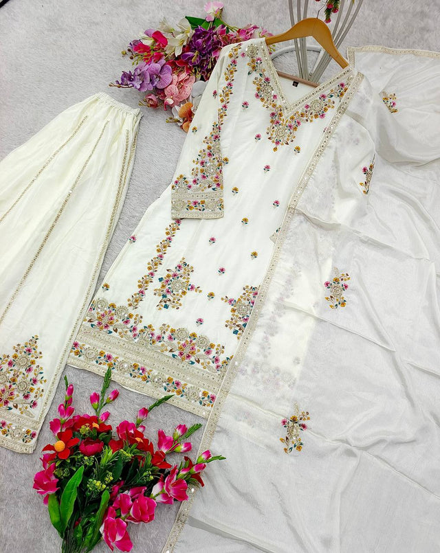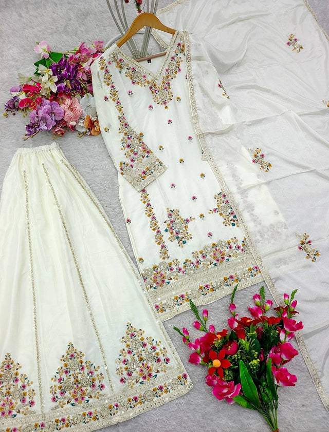Demanding Embroidery 5mm Work White Color Sharara Suit