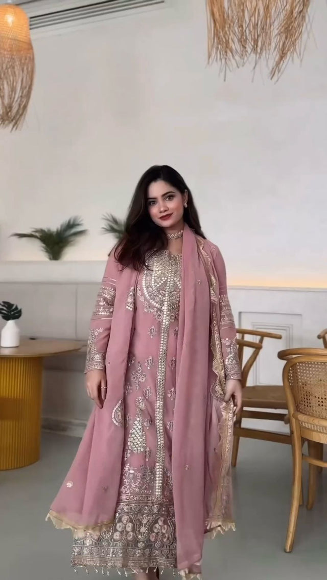 Demanding Embroidery Sequence Work Peach Color Anarkali Suit