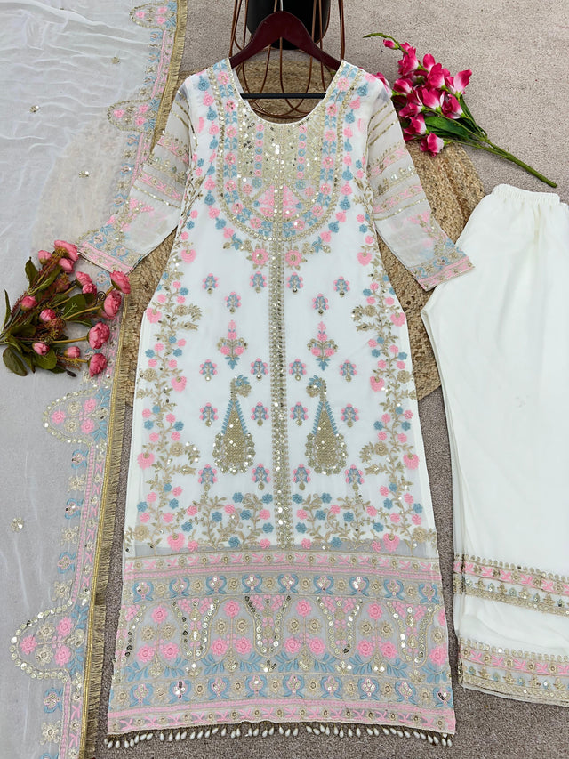 Demanding Embroidery Sequence Work White Color Anarkali Suit