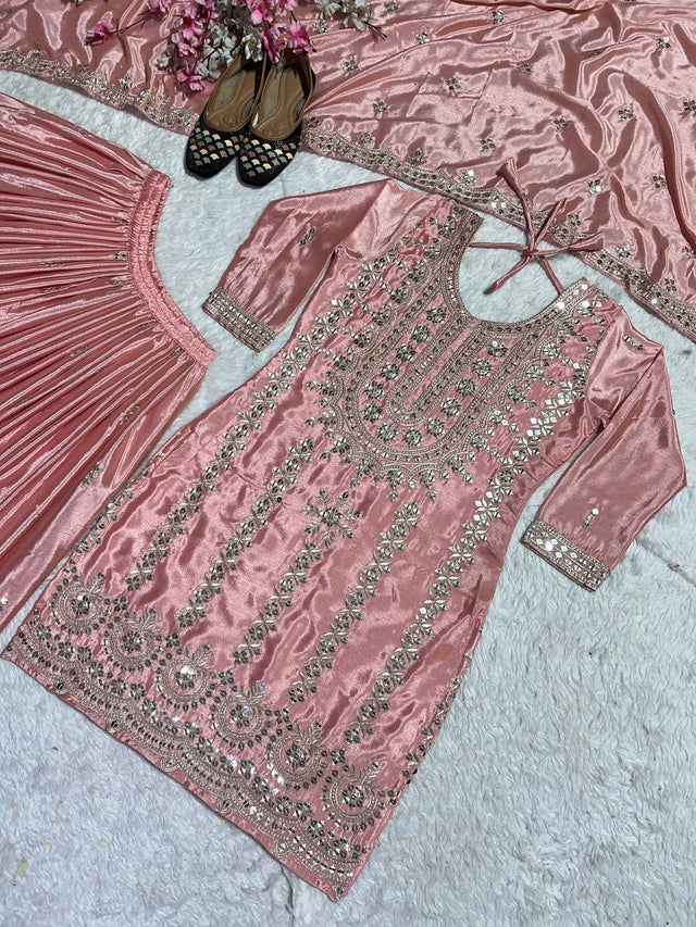 *Palazzo Fabrics* :Pure Heavy Chinnon Silk Heavy Embroidery Work With Fancy Borders Less Work Fully Flair.