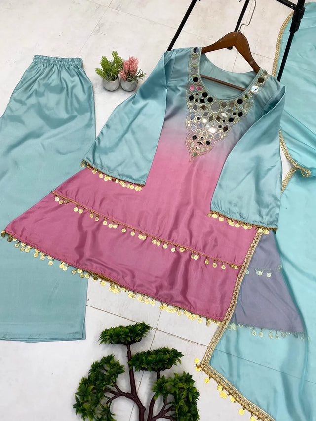 Upgrade your festive and party wardrobe with this designer 3-piece outfit, crafted to perfection with luxurious fabrics and elegant detailing. This set includes a stylish top, flowy plazo, and a graceful dupatta – making it the perfect blend of comfort and glamour.