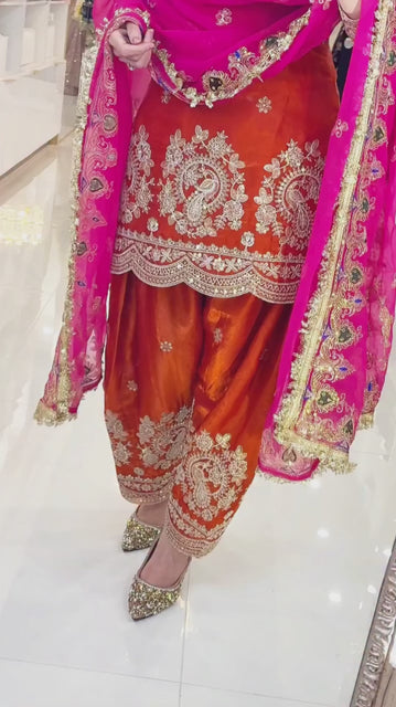 Make a statement at every celebration with this elegant designer party wear top and farshi salwar set. Crafted in rich Fandy Crushi Silk and detailed with intricate thread embroidery and sequin work, this outfit blends traditional grace with modern styling. The flowing farshi salwar adds royal elegance, making it a perfect choice for festive and special occasions.