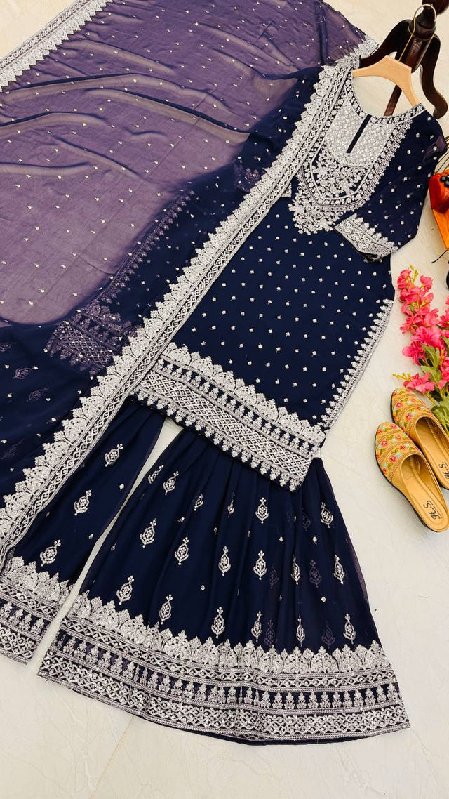 Designer Embroidery WIth Sequence Work Navy Blue Sharara Suit
