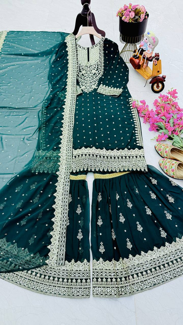 Designer Embroidery WIth Sequence Work Green Sharara Suit
