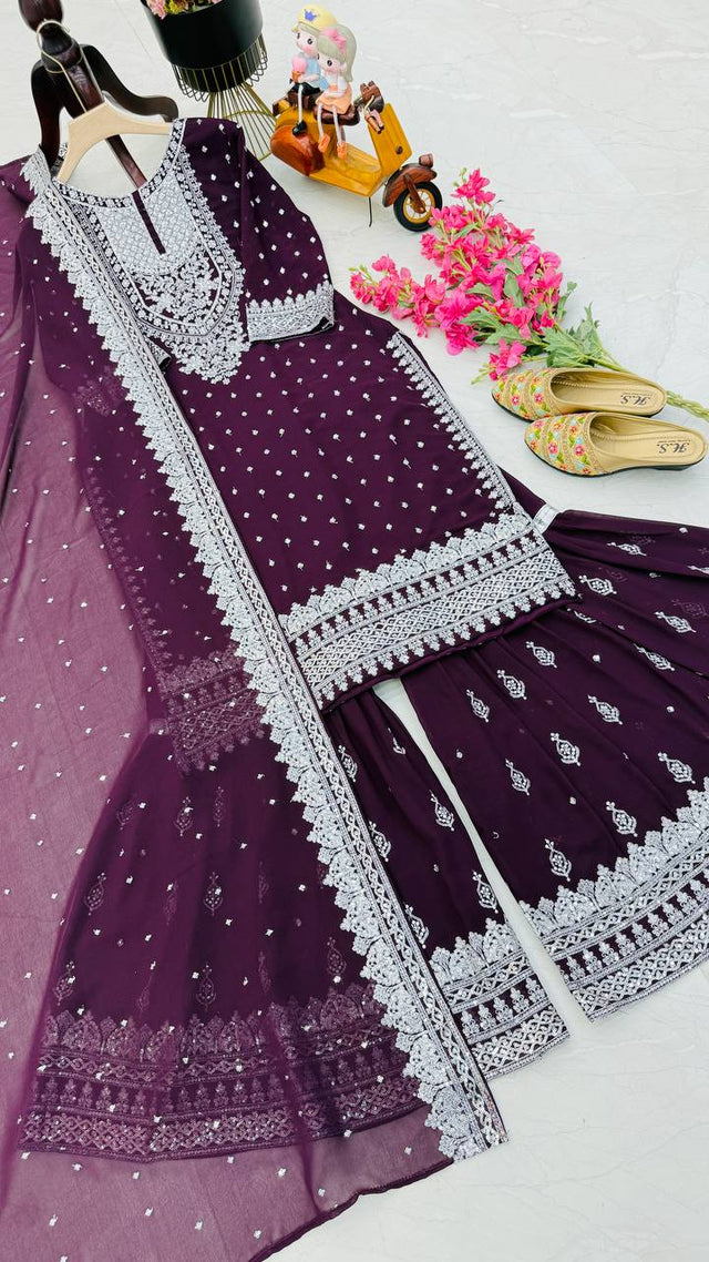 Designer Embroidery WIth Sequence Work Wine Sharara Suit