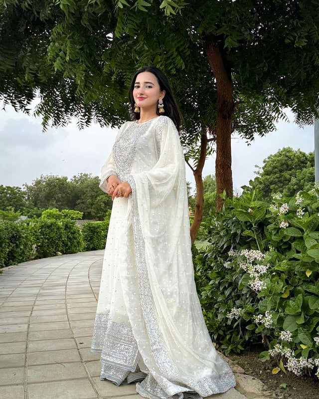 Designer Embroidery WIth Sequence Work White Sharara Suit