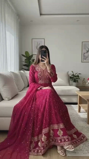 Presenting a fully stitched designer gown set crafted in premium pure georgette, highlighted with elegant 3mm sequins embroidery. Paired with a comfortable butter silk pant and a matching embroidered dupatta, this ready-to-wear ensemble offers a graceful silhouette and refined festive appeal, perfect for parties and special occasions.