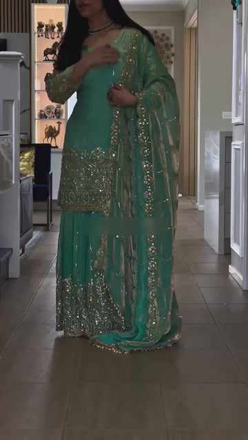 Designer Heavy NC Satin Embroidered Top Sharara Set with Dupatta