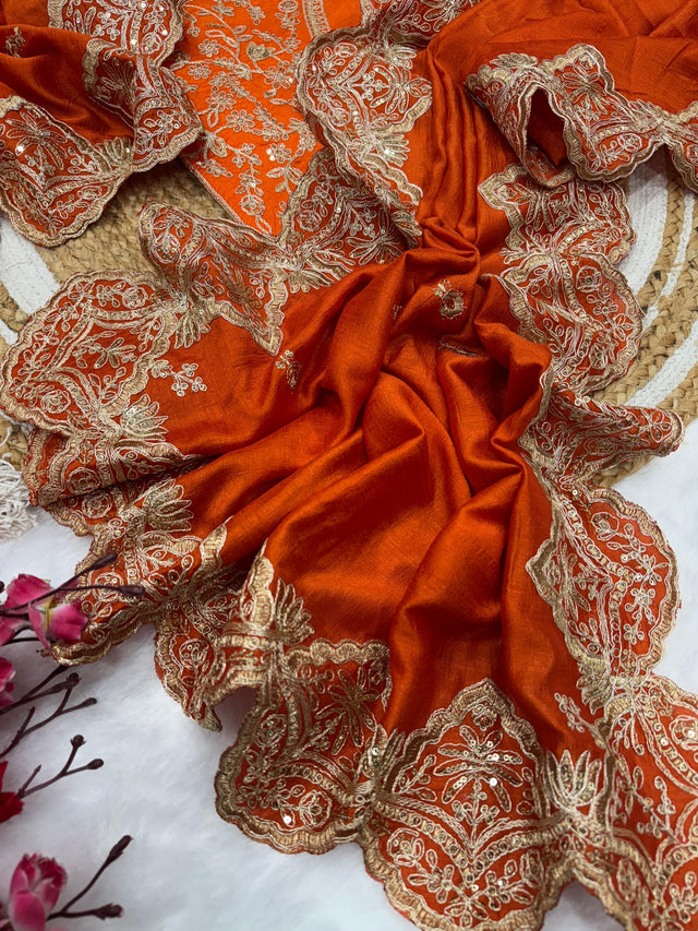 Bollywood Style Heavy Work Orange Color Silk Saree