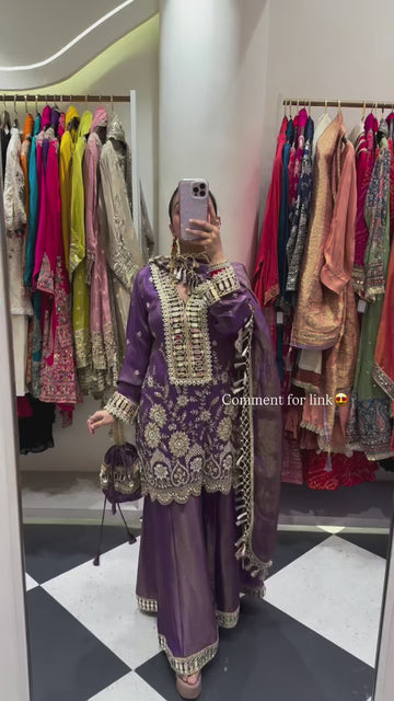 Celebrate the wedding season in style with this stunning designer kurti plazzo set, crafted in rich Coss Moss fabric and enhanced with elegant real mirror embroidery work. This fully stitched, ready-to-wear ensemble blends traditional craftsmanship with contemporary elegance, making it a perfect choice for festive occasions and celebrations.