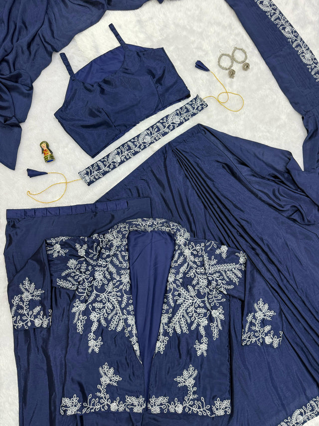 Designer Navy Blue Color Embroidery Work Saree With Koti