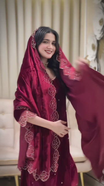 Presenting a new designer party wear look in heavy pure viscose velvet. This premium top, pant and dupatta set features rich detailing and is fully stitched, ready to wear. Designed for festive and party occasions with a luxurious velvet finish and intricate craftsmanship.
